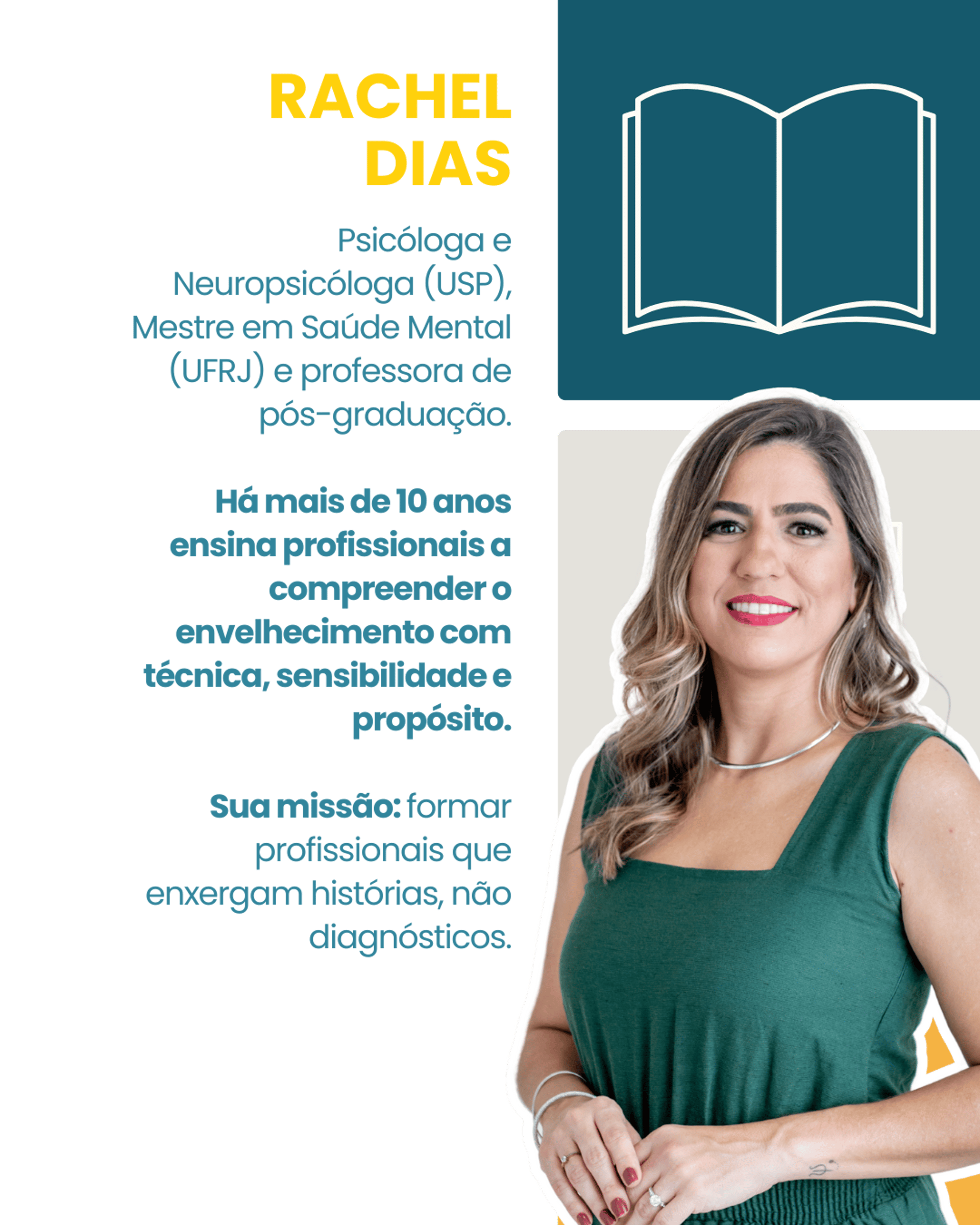 Há mais de 10 anos ensina profissionais a compreender o envelhecimento com técnica, sensibilidade e propósito.