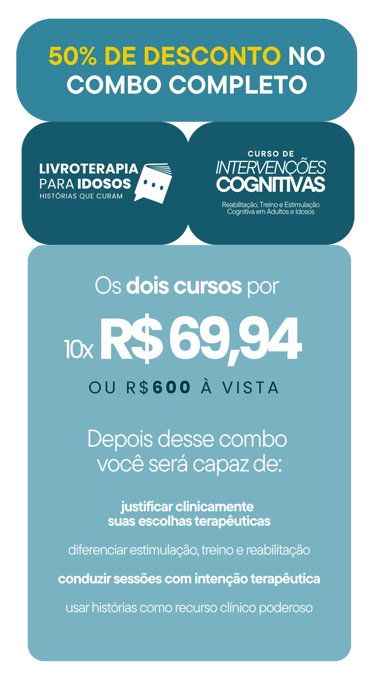 Ao final do curso, o participante será capaz de selecionar e adaptar livros de forma ética e estratégica para idosos com diferentes perfis (ativos, com demência leve a moderada, baixa escolaridade). Conduzir rodas de leitura ou atendimentos individuais que unem cognição, emoção e vínculo humano. Usar histórias como recurso de estimulação cognitiva, regulação emocional e resgate autobiográfico. Criar materiais complementares e recursos criativos a partir dos livros. Sentir-se seguro(a) e inspirado(a) para aplicar livroterapia já na sua prática profissional.